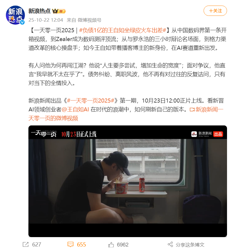 IT之家 10 月 22 日消息,新浪新闻今日发布《一天零一页 2025》栏目预告片,王自如在片中乘绿皮火车出行,称因限高只能选择这种出行方式。