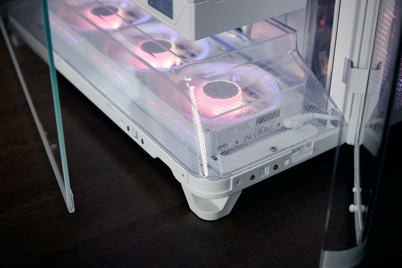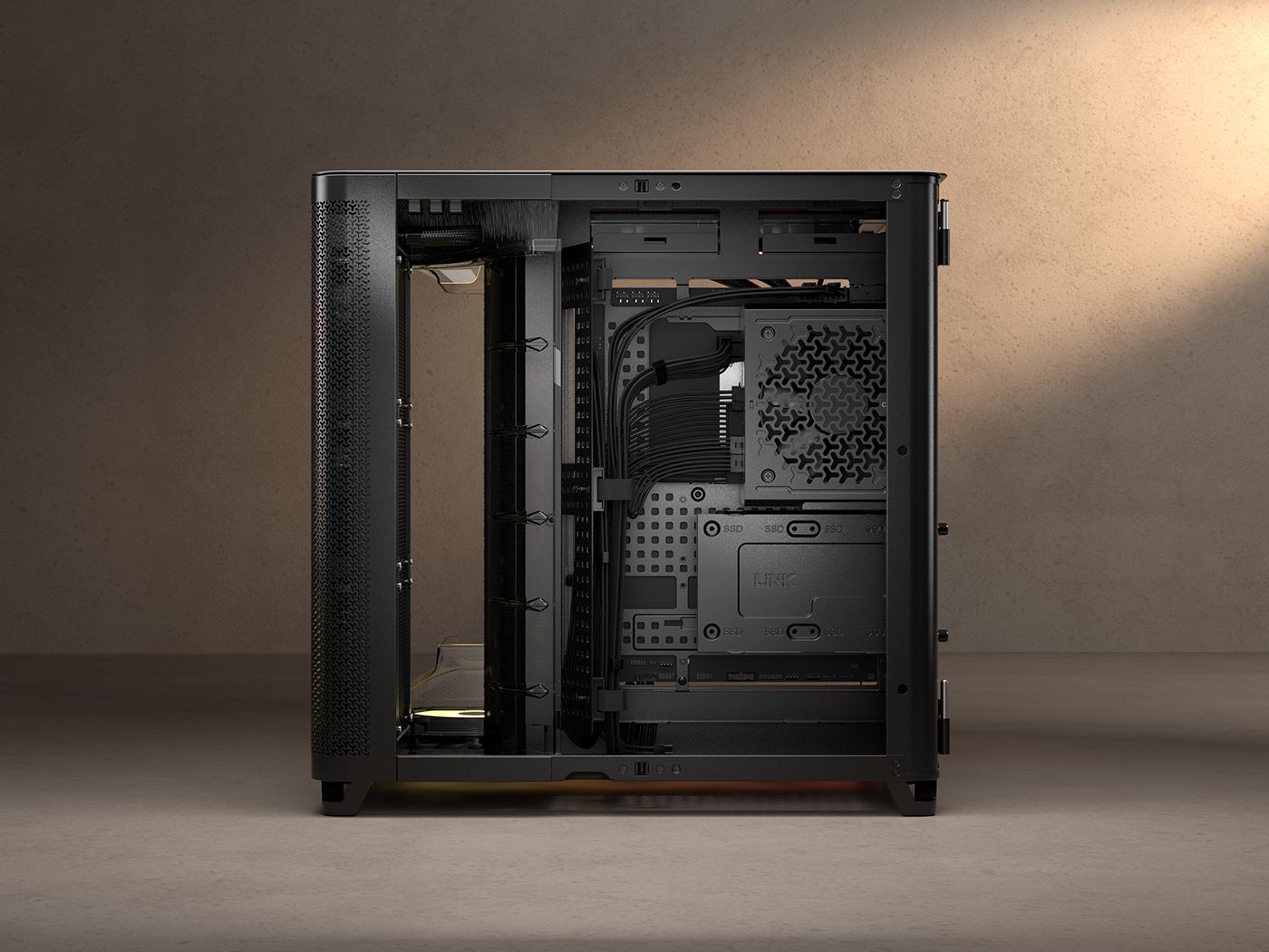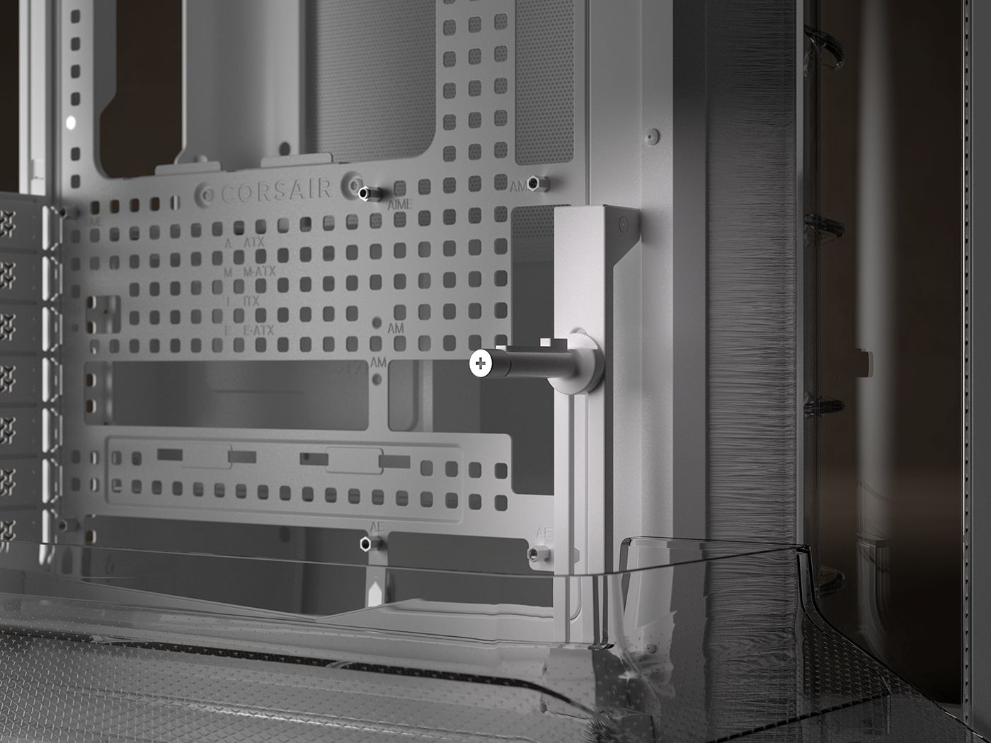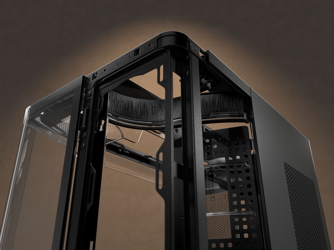 该机箱采用无柱海景房设计,前左两侧采用双曲面玻璃法式门面板,主腔上下各有一组导风气流管道,右前腔也包含侧出风导流结构。其兼容背插主板,配备方便理线的 RapidRoute 2.0 穿孔板式主板托盘,内置 GPU 防垂稳定臂。