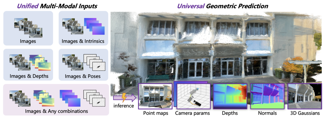 此外,混元世界模型 1.1 还支持额外的相机、深度等多模态先验输入,并基于统一架构实现点云、深度、相机、表面法线和新视角合成等多种 3D 几何预测。