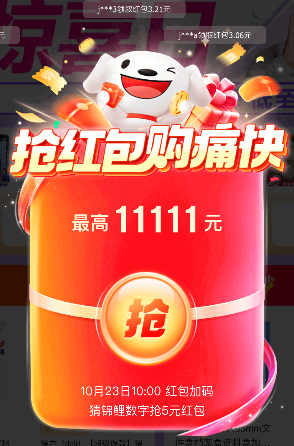 活动期间用户可参与猜数字玩法,每人 3 次机会,猜中锦鲤数字后即可获得领取额外奖励的机会,可随机获得京东红包、品类东券或店铺券等奖励。