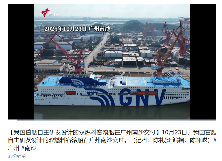 IT之家 10 月 23 日消息,综合广东新闻联播、科技日报报道,由中船集团旗下广船国际建造的我国首艘自主研发设计的双燃料客滚船“GNV・VIRGO(GNV・室女座)”号于今日在广东广州南沙命名交付。