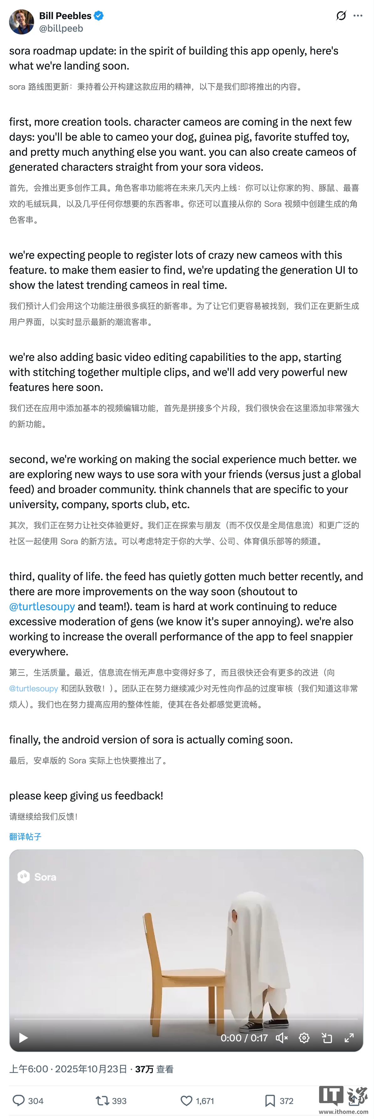 IT之家 10 月 24 日消息,据外媒 TechCrunch 今日报道,OpenAI 的热门 AI 视频应用 Sora 即将推出一系列更新:视频编辑工具、为宠物和其他物品创建角色“客串”、优化社交功能等。OpenAI 还表示,安卓版本“很快就会推出”。