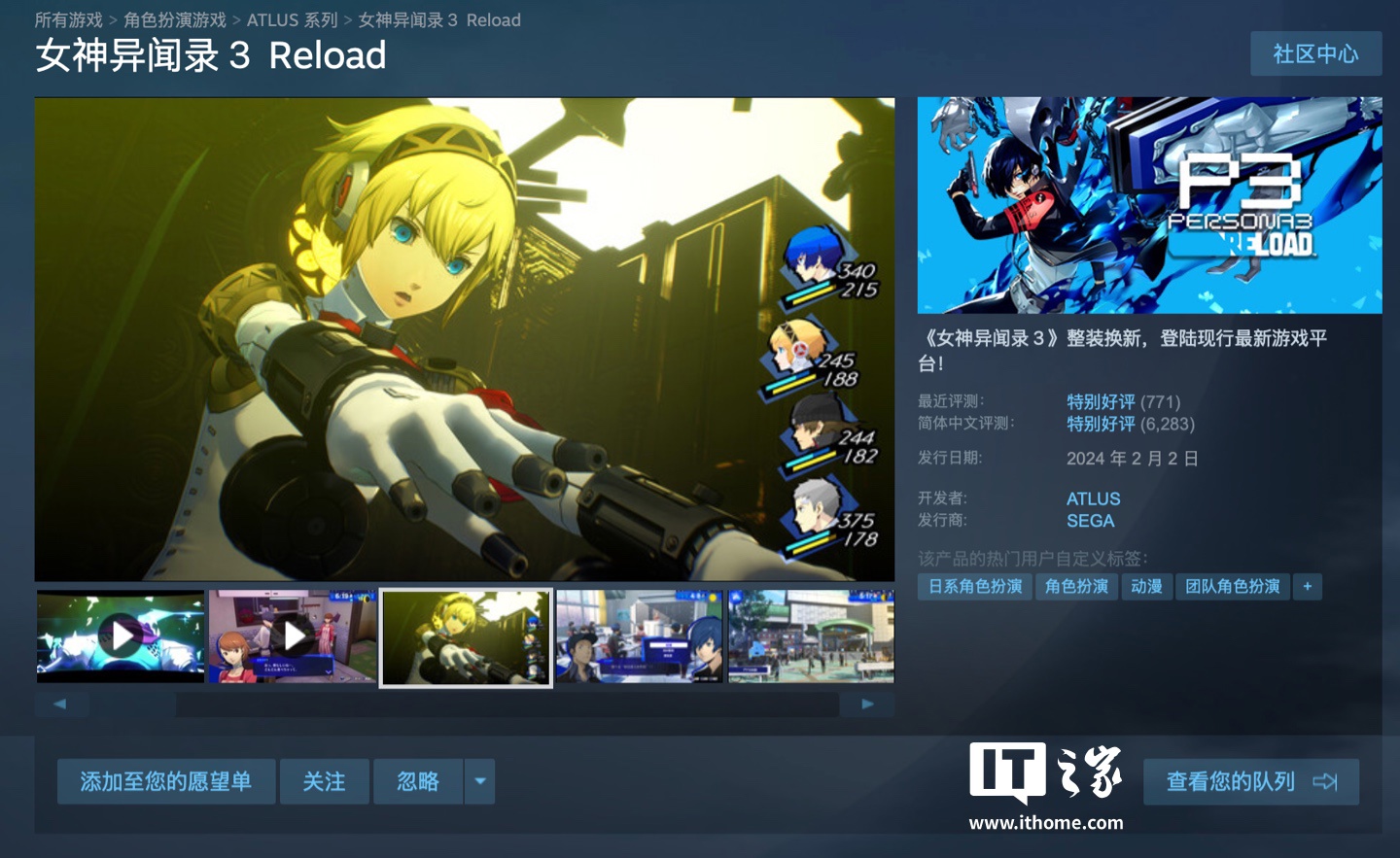 IT之家 10 月 24 日消息,游戏《女神异闻录 3 Reload》现已在 Steam 平台迎来价格调整,游戏在国区原价 298 元起,现价 268 元起,截至IT之家发稿游戏好评率 94%“好评如潮”,游戏商品页,具体价格信息如下:
