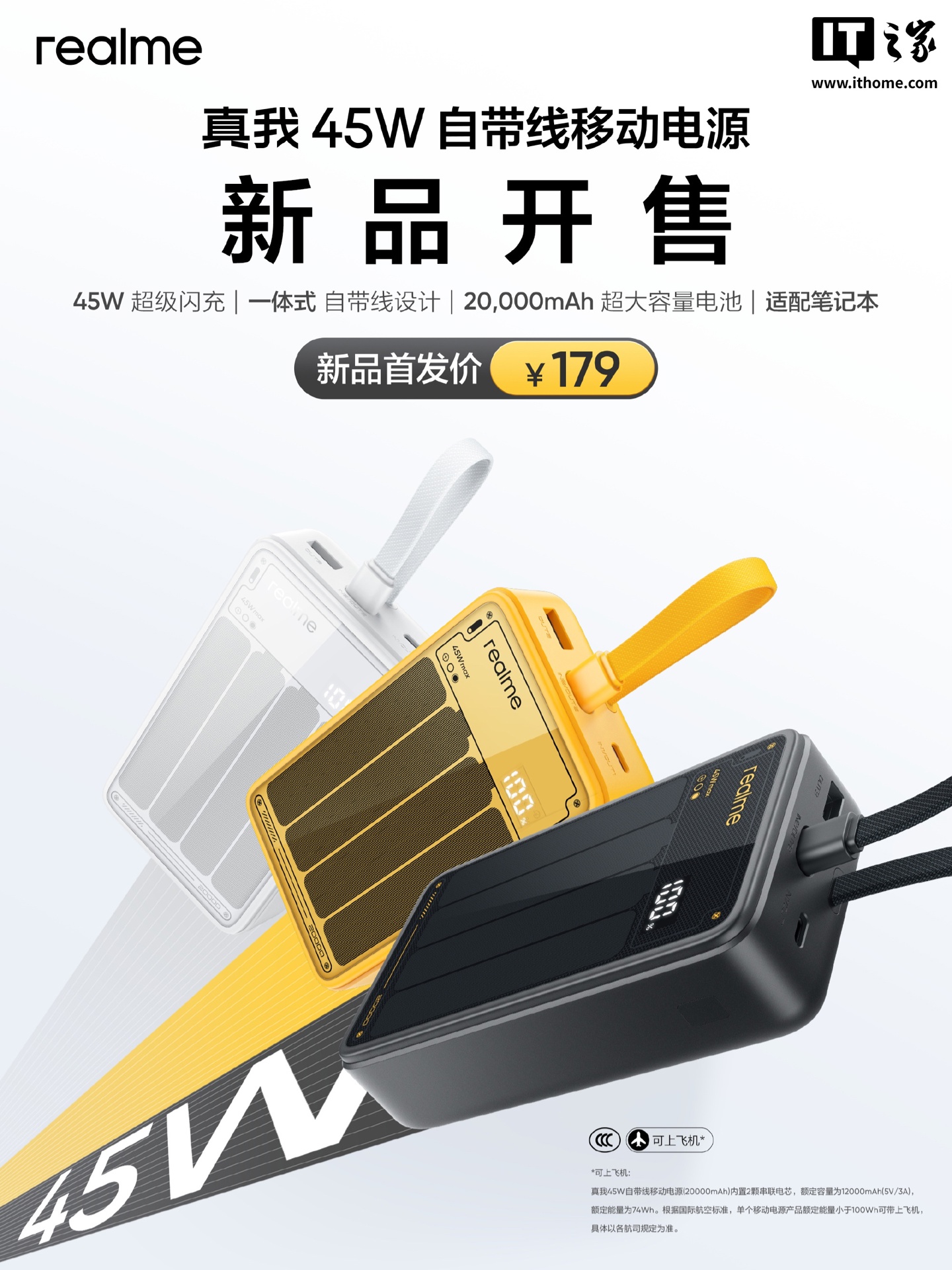 IT之家 10 月 24 日消息,realme 真我 45W 自带线移动电源现已在京东开售,这款产品采用 2C + 1A 设计,支持 45W 超级闪充,提供 20000mAh 电芯,售价 179 元。