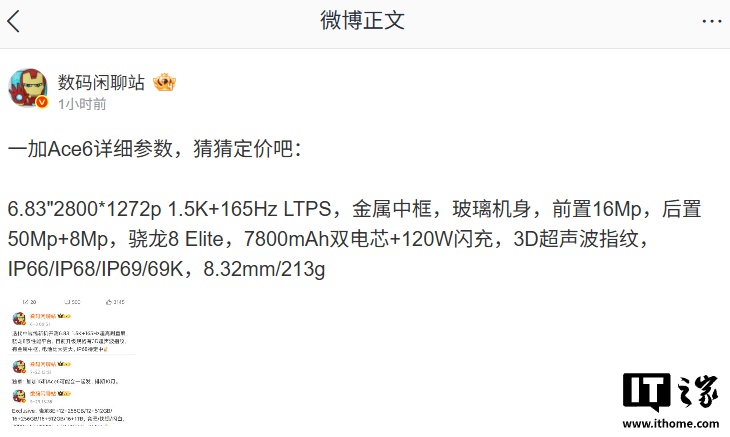 IT之家 10 月 24 日消息,博主 @数码闲聊站 今日曝光一加 Ace6 手机详细参数,这款新机将于 10 月 27 日与一加 15 手机一同发布。