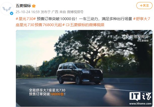 IT之家 10 月 24 日消息,五菱汽车今日宣布,五菱星光 730 大 7 座 MPV 预售订单破万。该车于 10 月 15 日开启预售,共推出四款车型配置,预售价为 7.68 万元-11.28 万元。