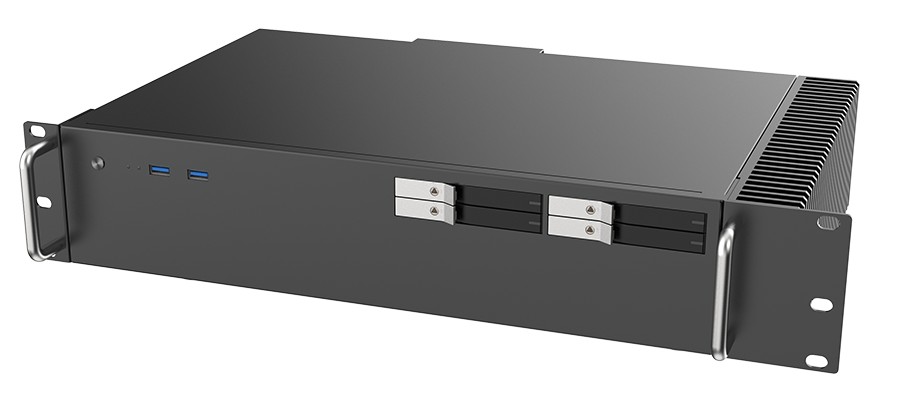 Kepler 机箱采用双热管 + 铝制鳍片散热系统,配备 1U 高度 150W 无风扇 AC-DC 电源,正面提供 4 个支持热插拔的 2.5 英寸 SATA 盘位、背部则包含 4 个半高 PCIe 插槽。