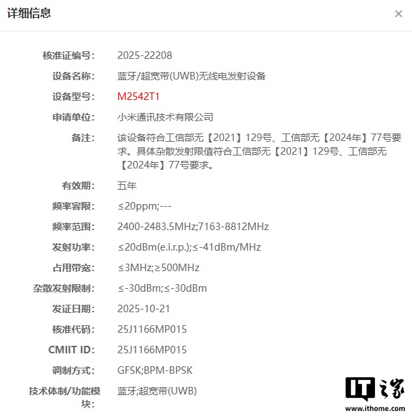 IT之家 10 月 24 日消息,一款型号为 M2542T1 的小米神秘穿戴设备于 10 月 21 日在工信部入网,支持 UWB 技术,目前尚不清楚这款新品的更多消息。