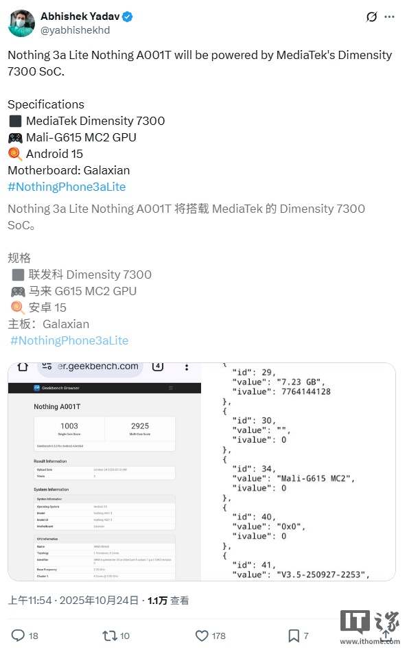IT之家 10 月 24 日消息,@Abhishek Yadav 今天在 Geekbench 中发现了一款神秘 Nothing 新机,并称其为 Nothing Phone (3a) Lite。