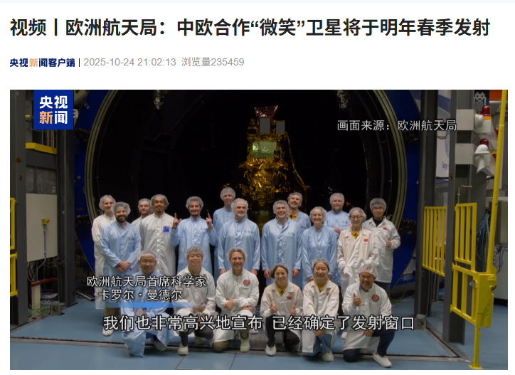 欧航局告诉央视总台记者,中欧联合研发的“微笑”卫星预计将于明年四至五月间在法属圭亚那库鲁航天中心发射,欧航局将继续深化与中国合作。“微笑”卫星项目由中国科学院国家空间科学中心和欧洲航天局联合实施,用于研究太阳活动如何影响地球磁场和空间环境,是了解地球与太阳相互作用的重要科学任务。