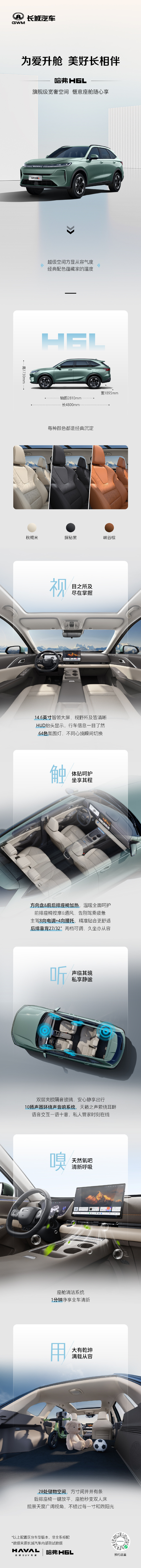 官方海报显示,这款新车长宽高分别为 4800/1895/1730mm,轴距为 2810mm。内饰提供秋褐米、探秘黑、峡谷棕三款配色。