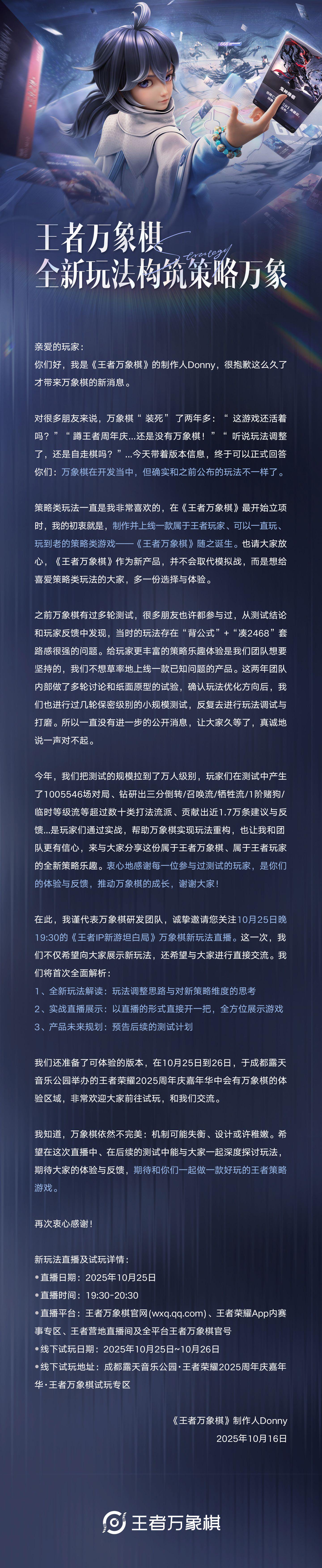 IT之家 10 月 26 日消息,在 10 月 25 日晚 19:30,腾讯《王者荣耀》IP 自走棋游戏《王者万象棋》开启直播,玩法实机制作人在线讲解了产品最新进展及爆料,并透露新作《王者万象棋》将在今年 12 月开启大规模测试。