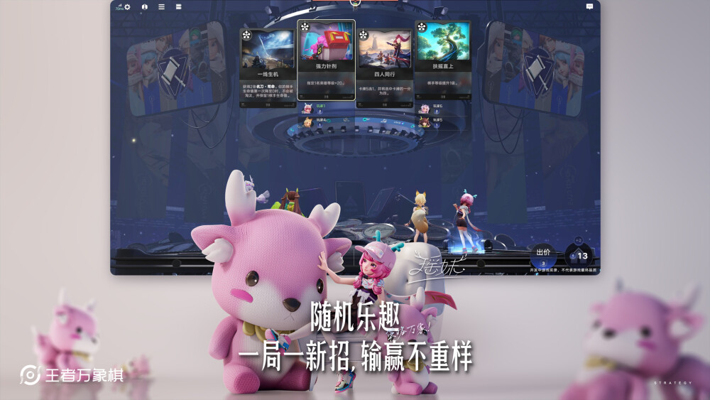 《王者万象棋》主打局内策略对战,公平竞技。每局比赛 6 位玩家巧用策略,各自为战。玩家可通过卡牌联动(即卡牌上的关键词之间的关联)提升英雄等级并获得战斗特性,配合使用拥有丰富技能机制的棋手,妙用拍卖、天赋、效果等 roguelike 事件,自由构筑多样阵容,解锁不一样的策略乐趣体验。