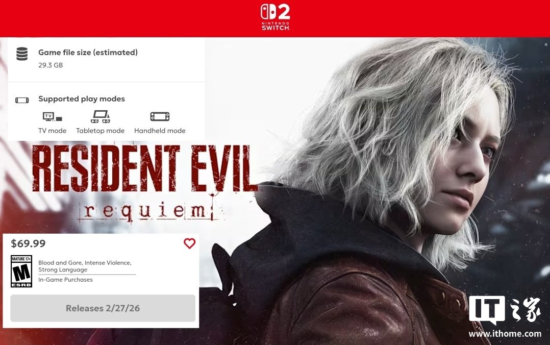 IT之家 10 月 26 日消息,《生化危机:安魂曲》是《生化危机》主系列的第九部正统作品,将于 2026 年 2 月 27 日正式登陆 Switch 2 平台。数周前,卡普空(Capcom)宣布该游戏将在 Switch 2 平台上同时推出实体版与数字版,但实体版本将采用“游戏密钥卡”(Game-Key Card)形式发行。该公司当时表示,这一决定属于其“销售策略”的一部分。最新消息显示,这一选择似乎与游戏本身的文件大小并无关联。