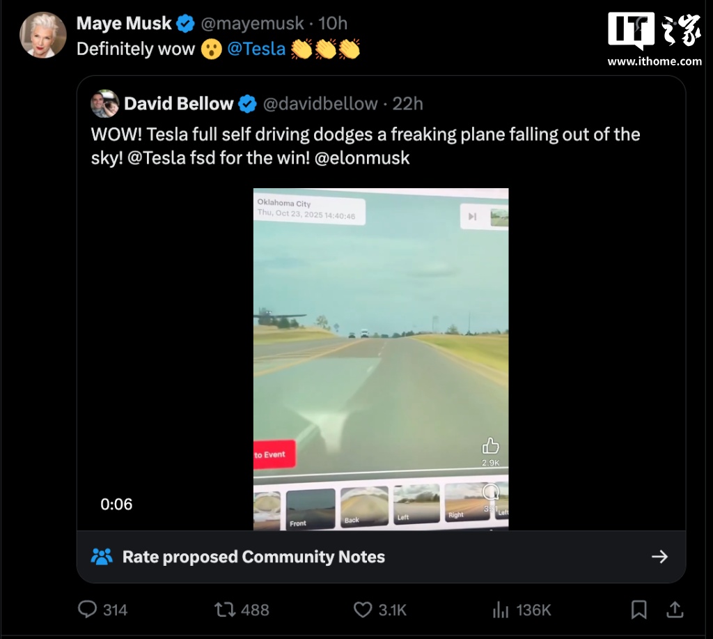 该视频迅速走红网络,配文称“FSD 救了他们一命”。甚至连埃隆・马斯克的母亲也转发了相关内容。