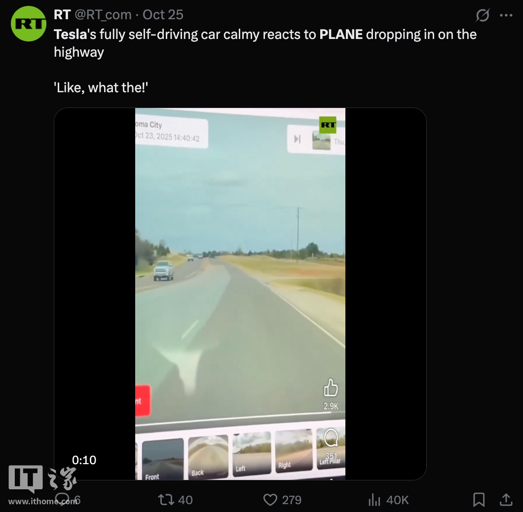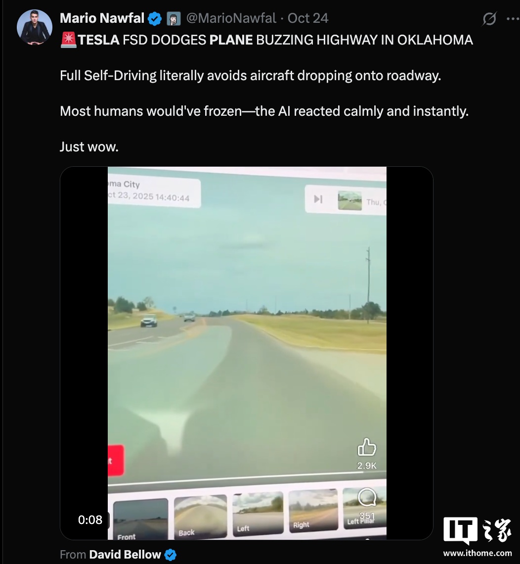 IT之家 10 月 27 日消息,近日有不少海外网友声称一辆启用 FSD 功能的特斯拉汽车成功避让了一架坠落至道路附近的飞机,引发热议。然而,涉事车辆驾驶员已证实,当时该车并未开启 FSD。