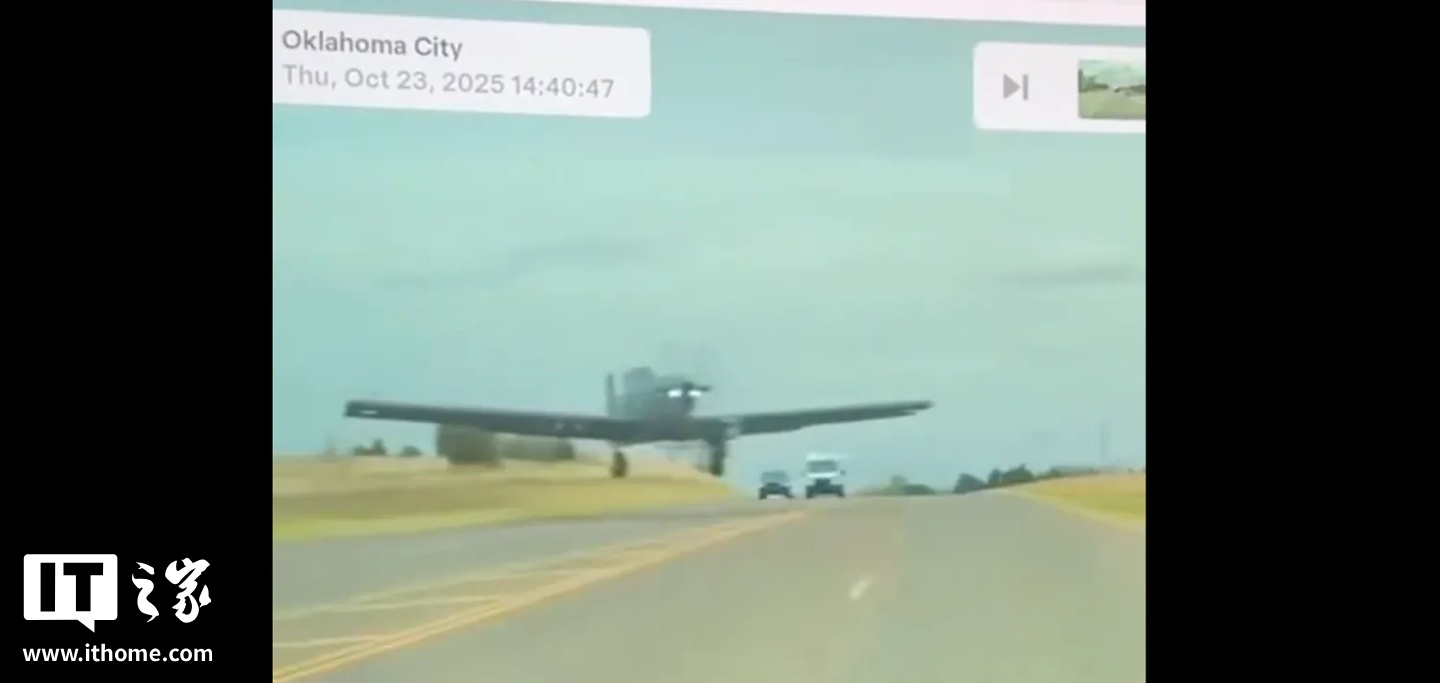 当地时间上周四下午,一架隶属于美国空军特种作战司令部的 OA-1K Skyraider II 飞机在俄克拉荷马城起飞不久后坠毁,目前事故仍在调查中。飞机坠落地面前曾极低空掠过一条高速公路,险些撞上多辆行驶中的汽车。这一惊险瞬间恰好被一辆特斯拉车内摄像头记录下来。