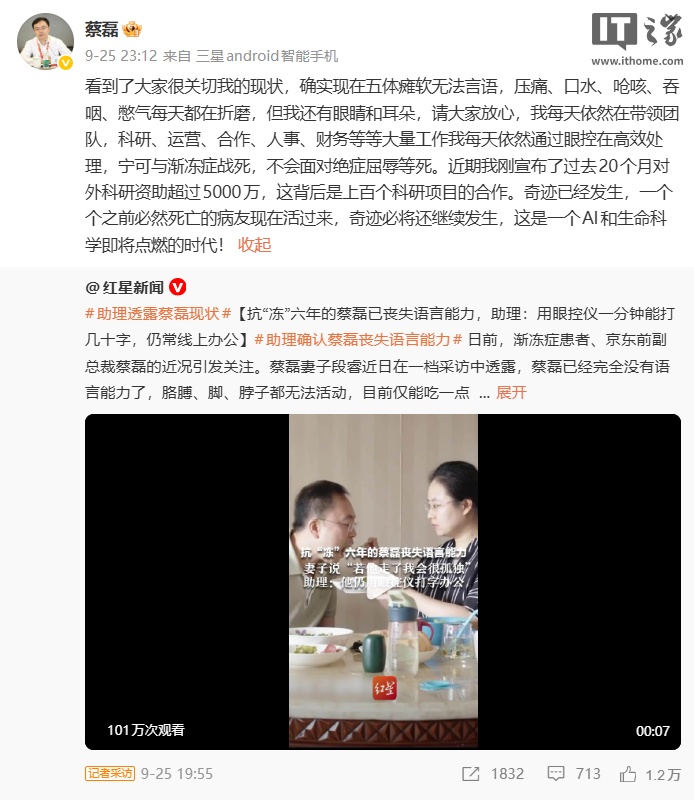 其妻段睿 9 月曾公开透露,蔡磊目前仅能摄入少量流食,“如果他走了,我会真的很孤独”。9 月 25 日晚,蔡磊在个人社交平台发文:“确实现在五体瘫软无法言语,压痛、口水、呛咳、吞咽、憋气每天都在折磨,但我还有眼睛和耳朵,请大家放心,我每天依然在带领团队。”他宣布,过去 20 个月对外科研资助已超 5000 万元,直接支持上百个合作项目,“奇迹已经发生,必将继续发生”。