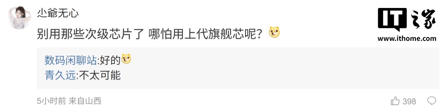 后续有用户在评论区回复道:“别用那些次级芯片了哪怕用上代旗舰芯呢