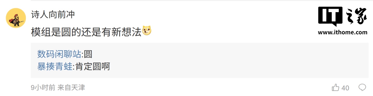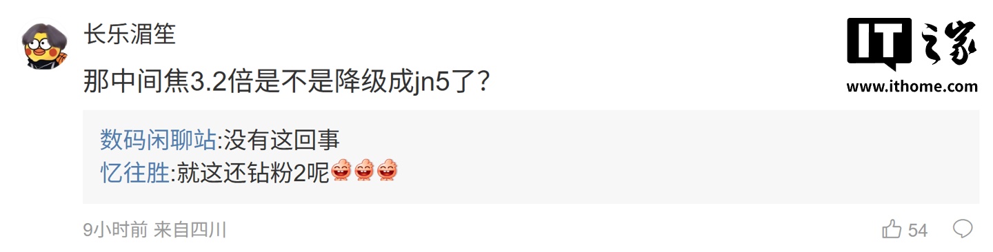 后续有用户在评论区询问博主:“那中间焦 3.2 倍是不是降级成 jn5 了?”,博主回复道:“没有这回事”;另一名用户则询问道:“模组是圆的还是有新想法