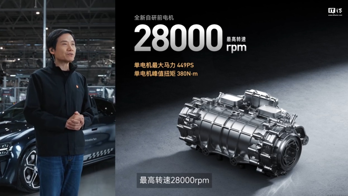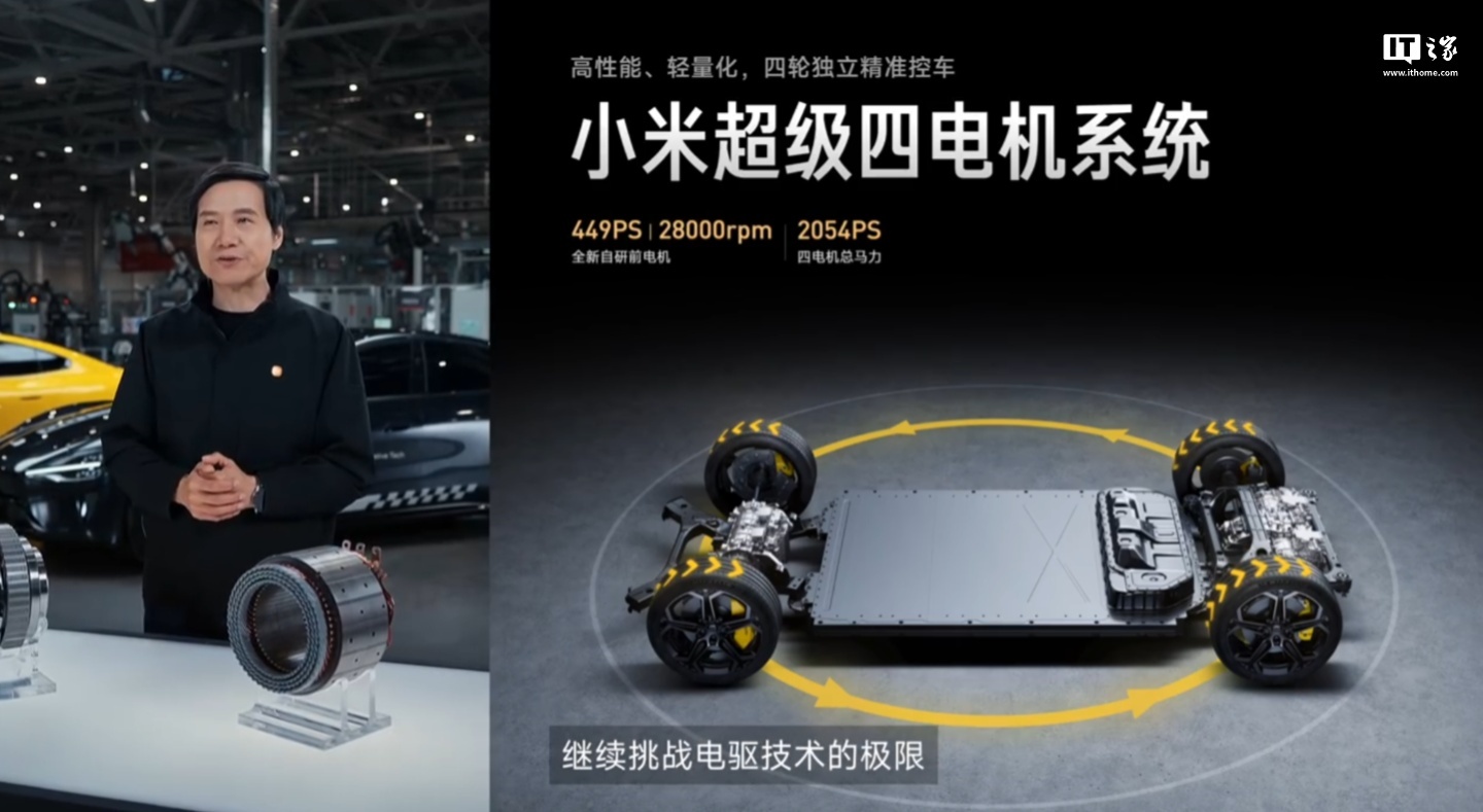 小米超级四电机系统迎来升级,包括 2 个全新自研电机 + 2 个 V8s 电机,最大马力可达 2054PS。全新自研前电机最高转速可达 28000 rpm,单电机最大马力 449PS,单电机峰值扭矩 380N・m。
