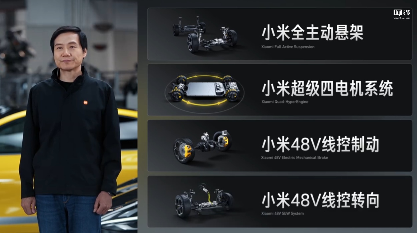 IT之家注意到,小米汽车去年 11 月公布了智能底盘预研技术,包括四项内容:
