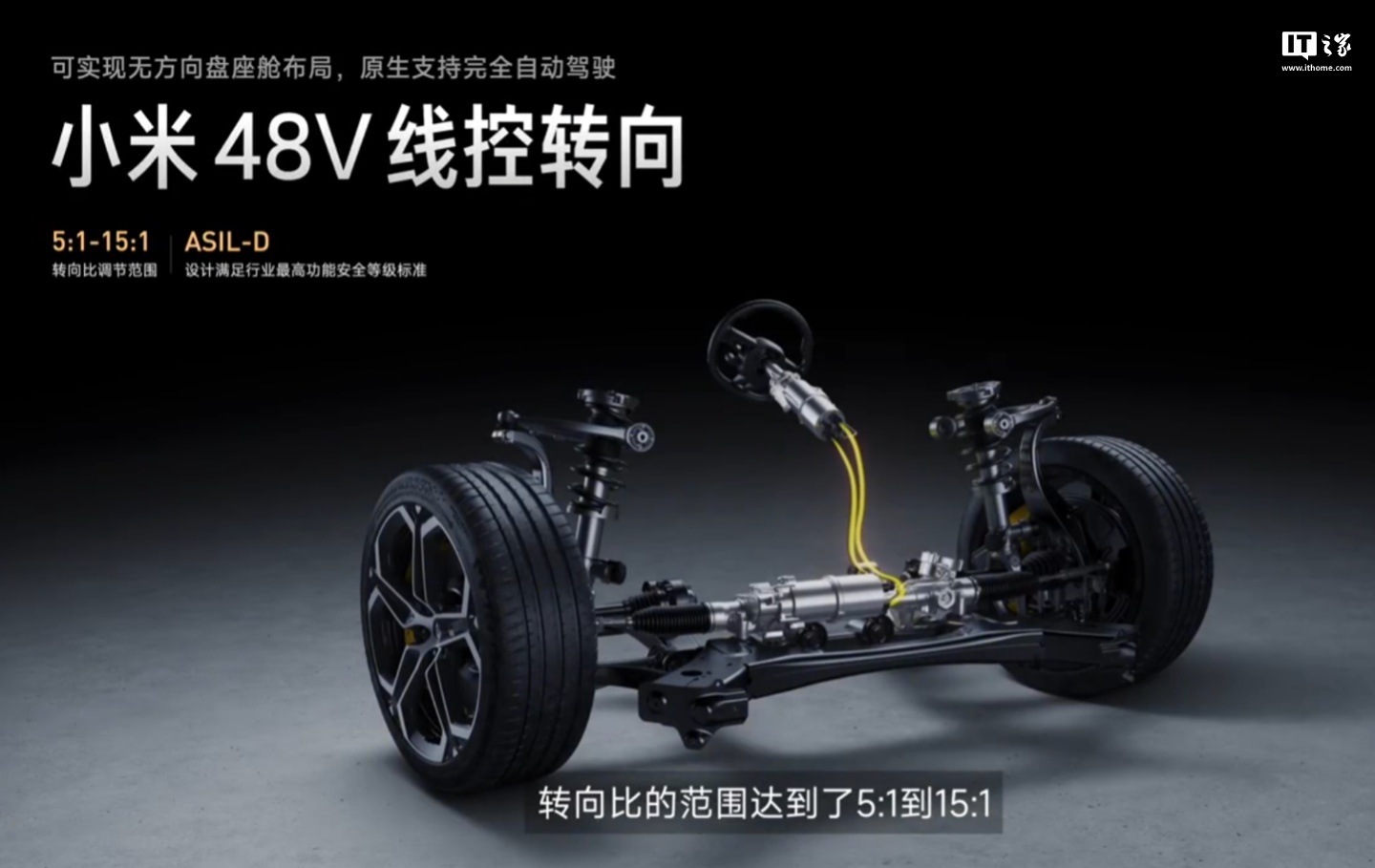 小米 48V 线控转向技术,可让方向盘和车轮的转向多少完全由软件控制,转向比调节范围 5:1 ~ 15:1 可调,可实现无方向盘座舱布局。