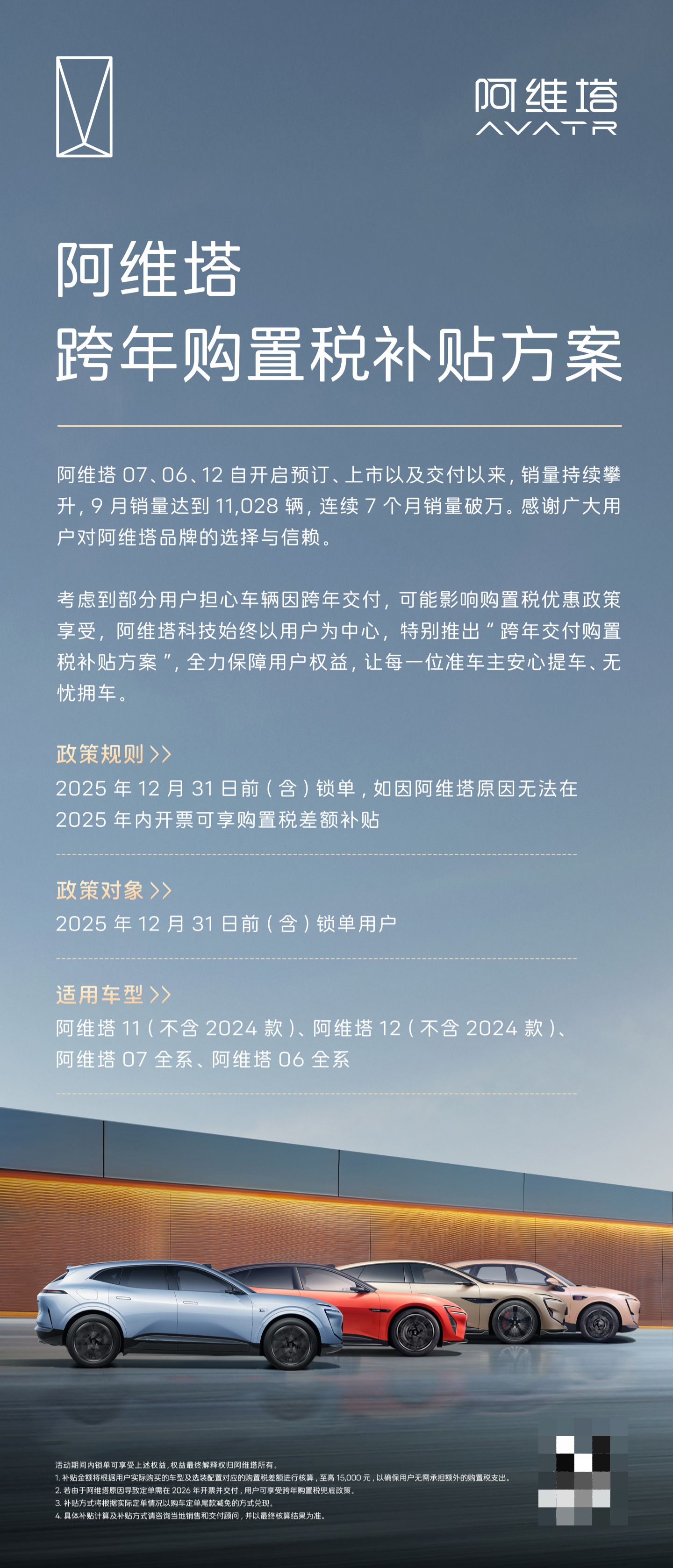 IT之家 10 月 28 日消息,阿维塔官方今日发布了跨年购置税补贴方案:2025 年 12 月 31 日前(含)完成锁单,若因阿维塔原因需在 2026 年交付,用户可享受跨年购置税兜底政策。