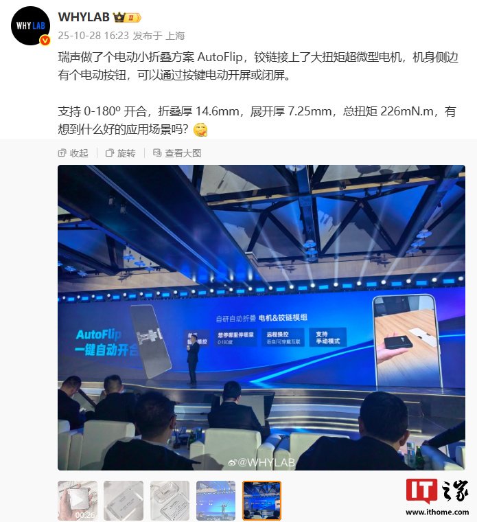 IT之家 10 月 28 日消息,据博主 @WHYLAB 今日分享,瑞声科技做了一个电动小折叠方案 AutoFlip,铰链接上了大扭矩超微型电机,机身侧边有个电动按钮,可以通过按键电动开屏或闭屏。
