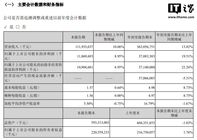 前三季度净利润 378.8 亿元,同比增长 19.51%;