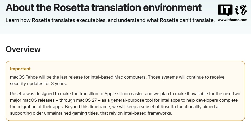 IT之家 10 月 29 日消息,苹果发布了一份关于 Rosetta 的开发者公告,确认今年的 macOS Tahoe 是最后一版适用于 Intel 架构 Mac 电脑的 macOS 系统。