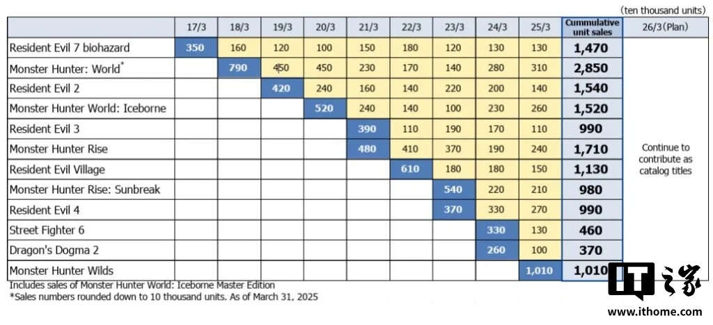 卡普空今年早些时候公布的一张幻灯片数据显示,在截至 2025 年 3 月的年度中,《怪物猎人:世界》在其发布的头七年里始终保持着惊人的长线销售势头。