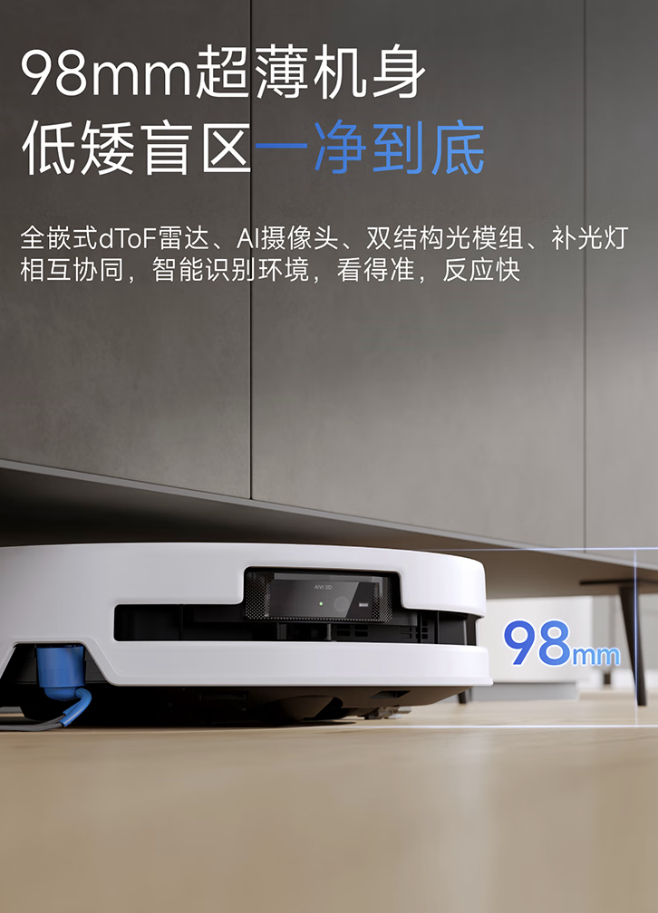 据介绍,这款扫拖机器人整体厚度 98mm,具备三重智驱升降,自动适配地毯、潮湿区等场景。升级恒压活水 2.0 洗地技术,提供 3800Pa 清洁压强配合高密度滚筒瓦解顽渍,号称可实现“四步活水循环”。