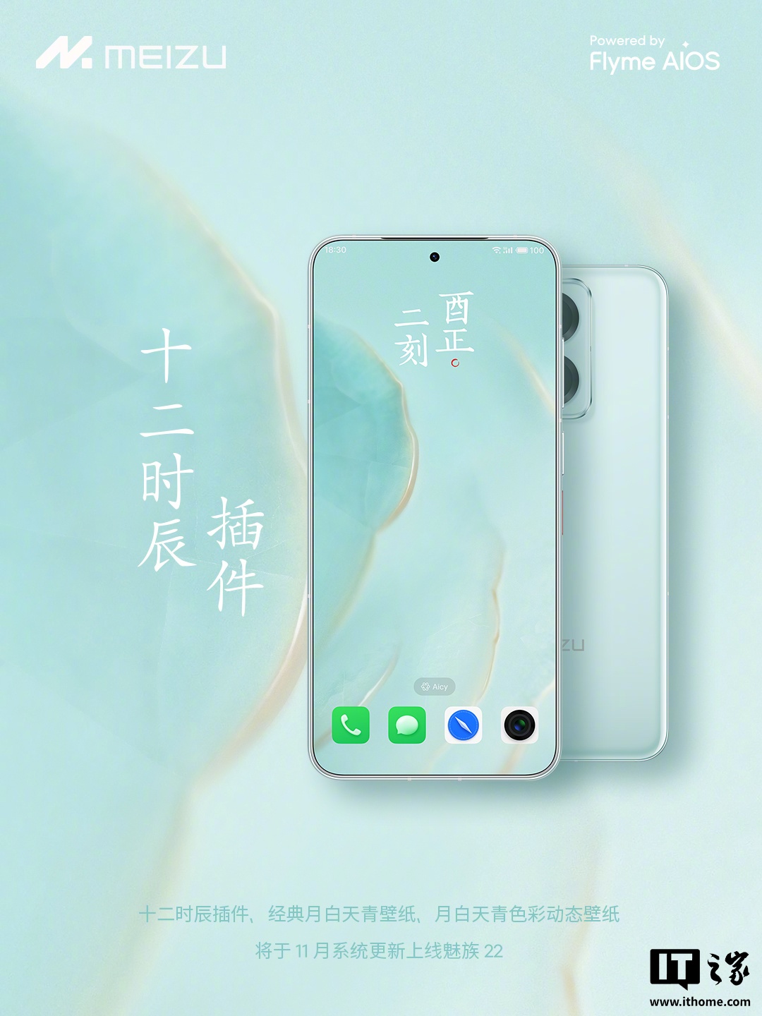 据介绍,魅族 22 的“月白天青”配色采用全新温润瓷感天青背盖,并配备 0.8mm 四等边独白面板。与之配套的月白天青经典壁纸、月白天青色彩动态壁纸、「十二时辰插件」等也于今日官宣将在 11 月的系统更新中上线。