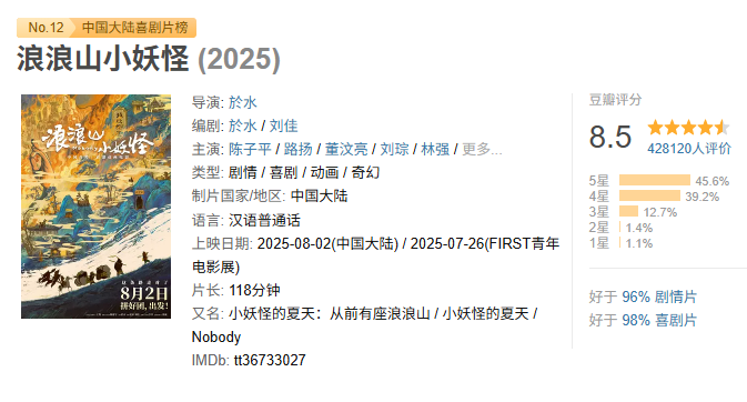 截至IT之家发文,该影片的豆瓣评分为 8.5 分,其中有 45.6% 的用户给出了五星好评,39.2% 的用户给出了四星评价。