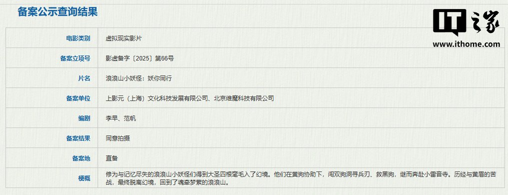 IT之家 10 月 31 日消息,国家电影局今日发布关于 2025 年 9 月下全国电影剧本(梗概)备案、立项公示的通知,《浪浪山小妖怪:妖你同行》现身虚拟现实影片类别。
