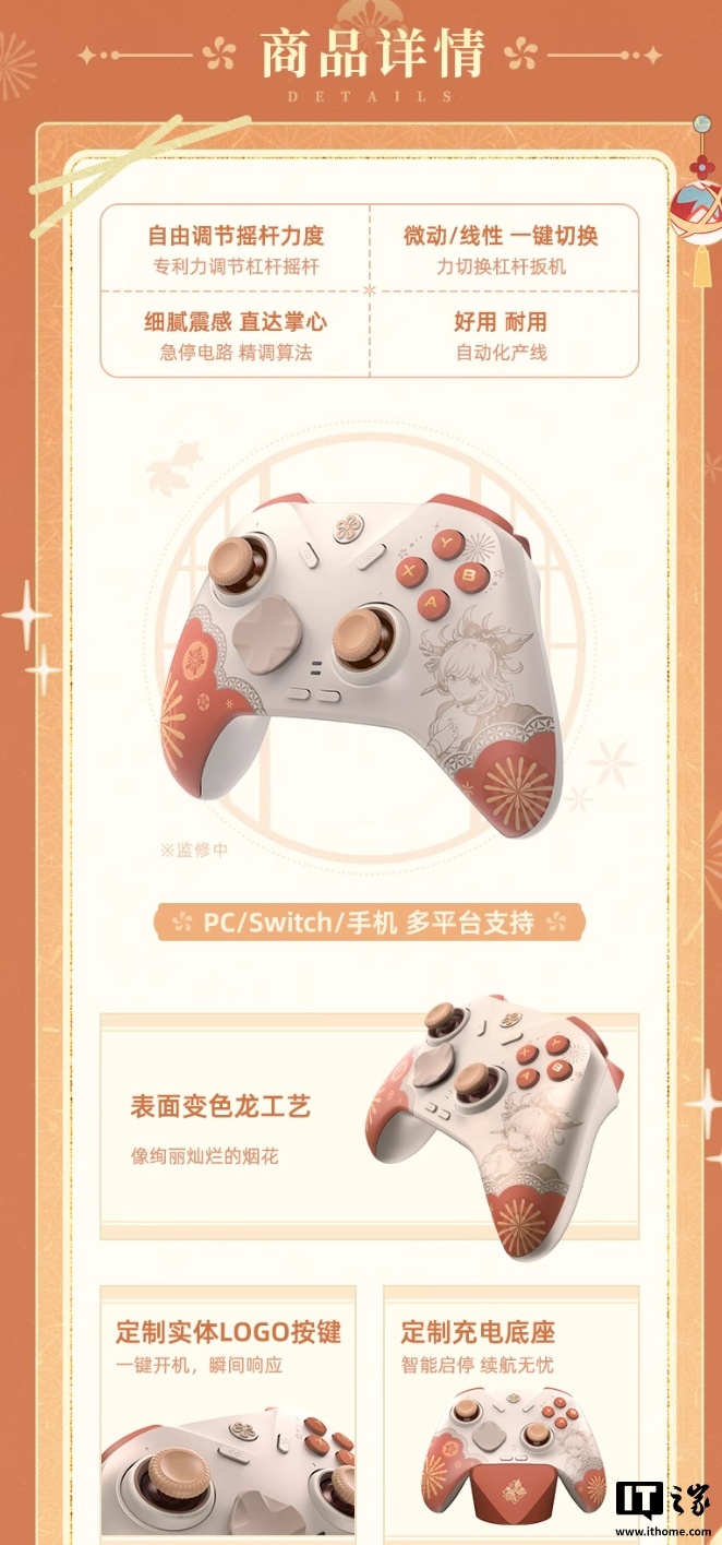 IT之家 10 月 31 日消息,米哈游新推出了一款“宵宫・琉焰华舞”游戏手柄套装礼盒(IT之家后续:含手柄、充电底座、定制摇杆帽、水音铃挂件),定价 399 元,今晚开启预售,预计 2026 年 1 月中旬到仓。