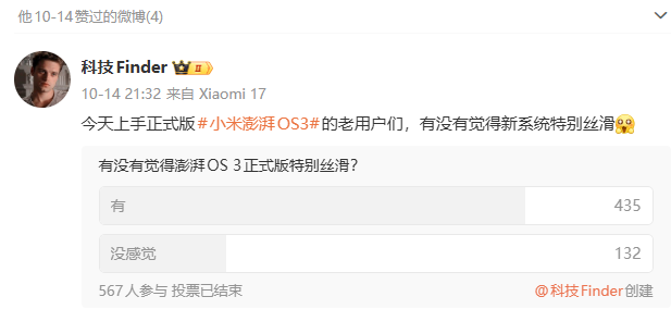 IT之家注意到,目前李创奇的微博认证仍为“小米公司影音文娱产品总监”,本月中旬还点赞过小米澎湃 OS3 相关微博。