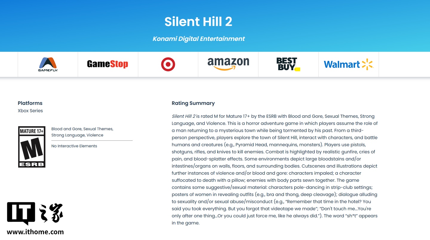 根据 ESRB 官网的数据,这款游戏被评为“M”(成熟)级别,与 PS5 / PC 版本完全相同,表明这款登陆 Xbox 平台的正是重制版,而非《寂静岭 2》的原版再发行。