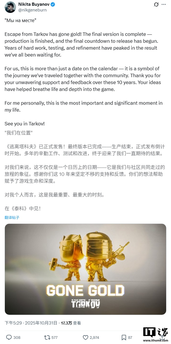 IT之家 10 月 31 日消息,《逃离塔科夫》开发商 Battlestate Games 游戏总监 Nikita Buyanov 今晚宣布,《逃离塔科夫》最终版本已制作完成 —— 制作全部结束,1.0 版本发布开始倒计时。