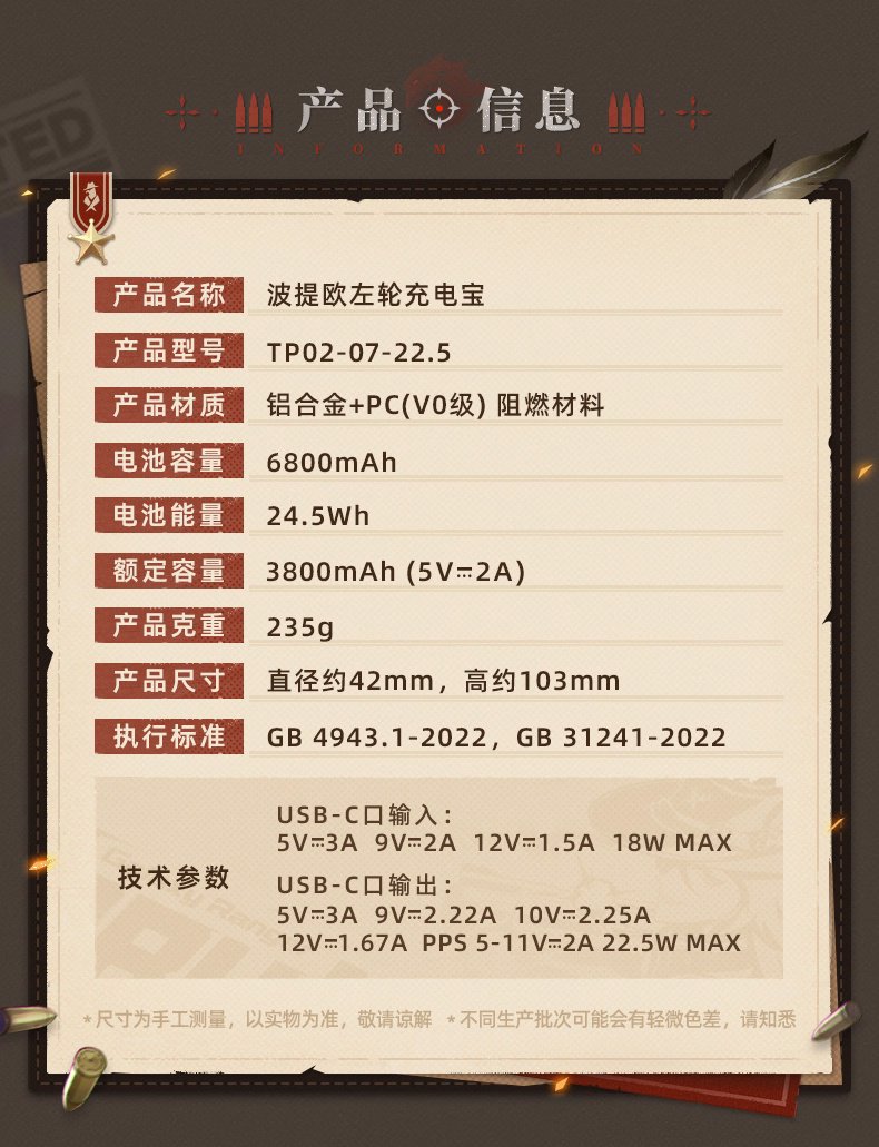 这款充电宝外观复刻波提欧左轮武器,重约 235g,配备 6800mAh 电芯(24.5Wh),额定容量 3800mAh(5V 2A),支持 225.W 快充,通过 3C 认证且符合航空安全标准,可安心携带登机及乘坐高铁。IT之家附参数详情: