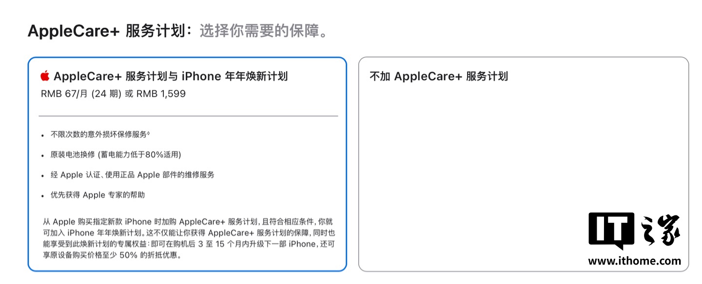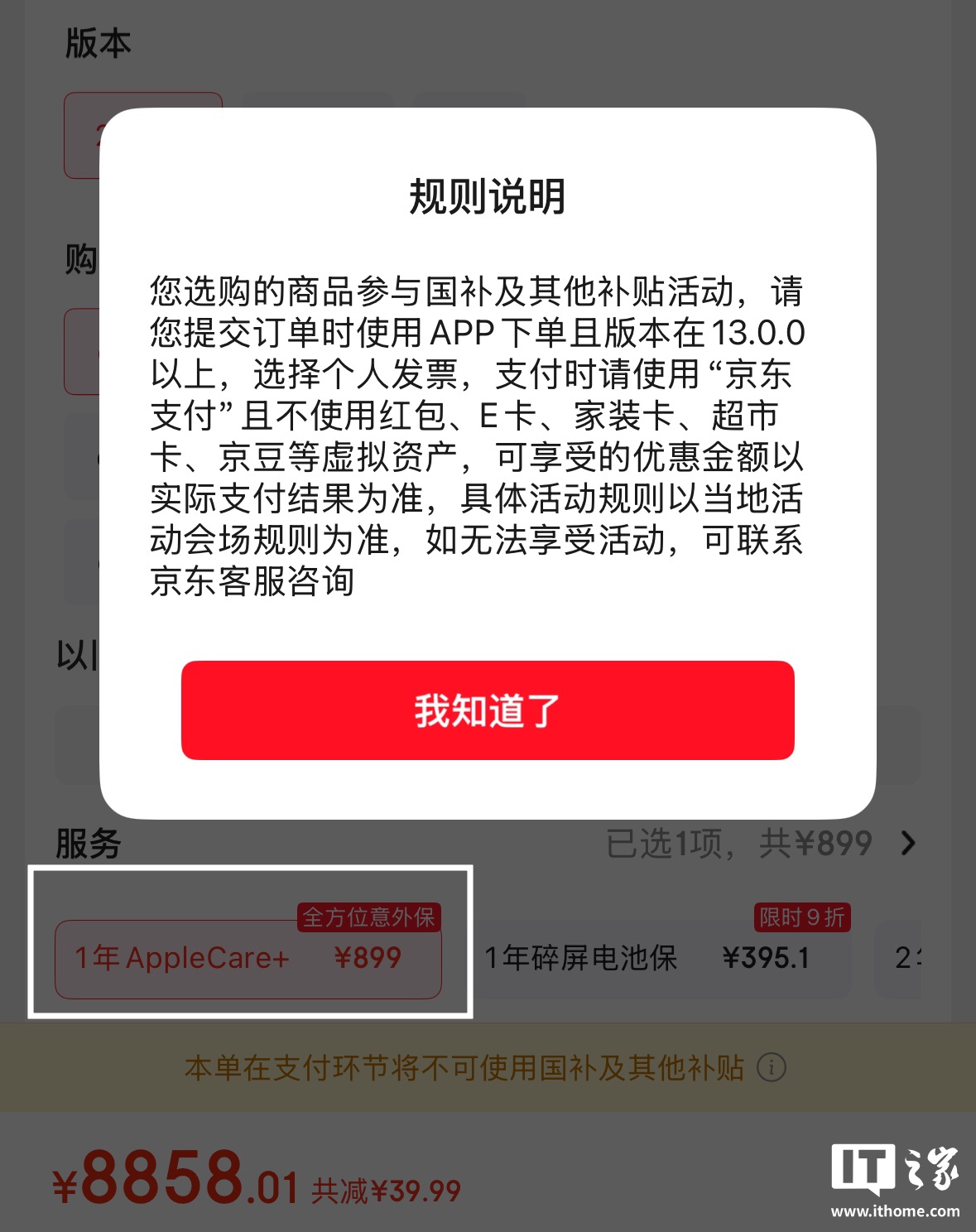 IT之家提醒,如果用户通过国补云闪付渠道下单该产品,则不支持以 899 元优惠价格加购 Apple Care+ 服务,用户后续购买 Apple Care+ 服务需要支付 1599 元。