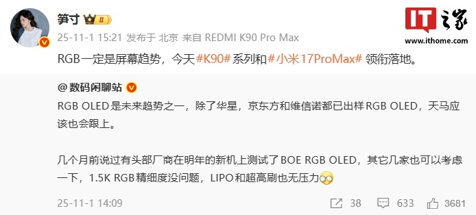 博主表示,几个月前说过有头部厂商在明年的新机上测试了 BOE RGB OLED,其它几家也可以考虑一下,1.5K RGB 精细度没问题,LIPO 和超高刷也无压力。