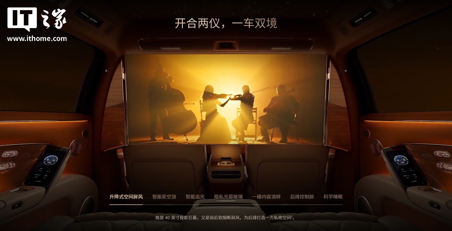 IT之家注意到,尊界 S800 轿车后排配备升降式空间屏风,官方介绍称其既是 40 英寸投影巨幕、又是前后软隔断屏风,可打造私密空间。另外,该车还实现首个轿车后排双零重力座椅布局。