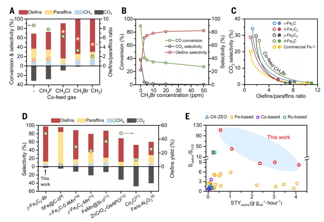 这一“分子手术式”策略无需改变催化剂配方,只需在反应体系中引入微量卤素,即可实现 CO₂近零排放与高烯烃选择性,具有即插即用的普适优势。