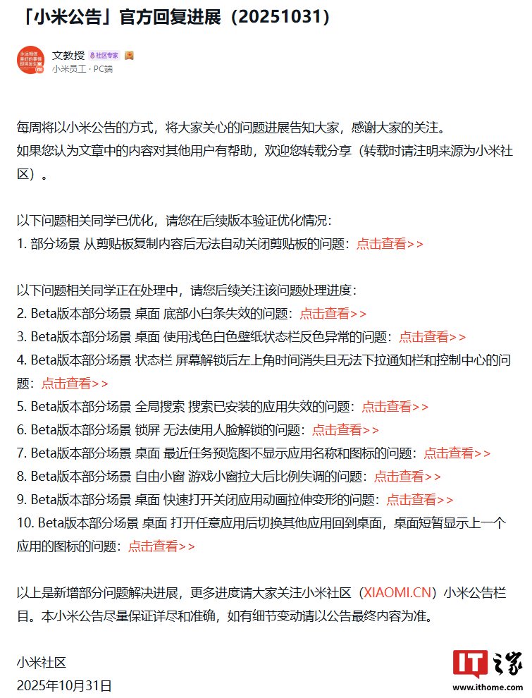 IT之家 11 月 2 日消息,小米员工本周在小米社区更新澎湃 HyperOS 的优化进展,其中提到用户所反馈的 Beta 版本从剪贴板复制内容后无法自动关闭剪贴板的问题已优化。此外他还公布了一些正在处理的问题,包括部分场景桌面底部小白条失效、桌面使用浅色白色壁纸状态栏反色异常等。