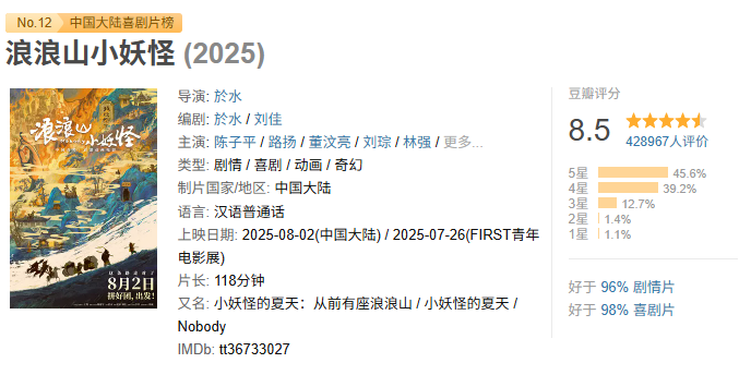 截至IT之家发文,该影片的豆瓣评分为 8.5 分,其中有 45.6% 的用户给出了五星好评,39.2% 的用户给出了四星评价。