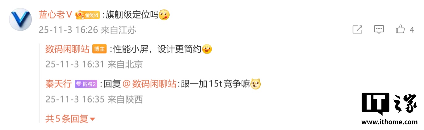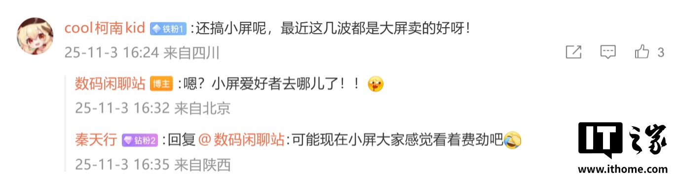 后续有用户在评论区询问:“旗舰级定位吗”,博主回复道:“性能小屏,设计更简约”;另一名用户则回复道:“还搞小屏呢,最近这几波都是大屏卖的好呀!”,博主则回复道:“嗯?小屏爱好者去哪儿了!!”。