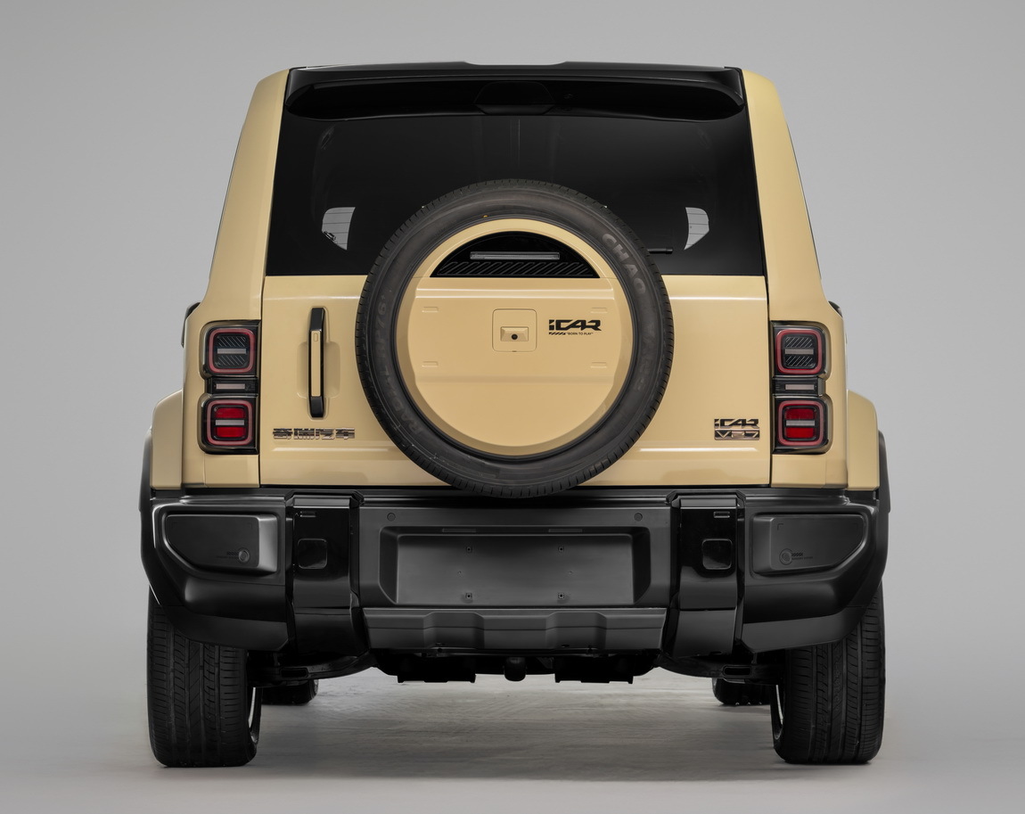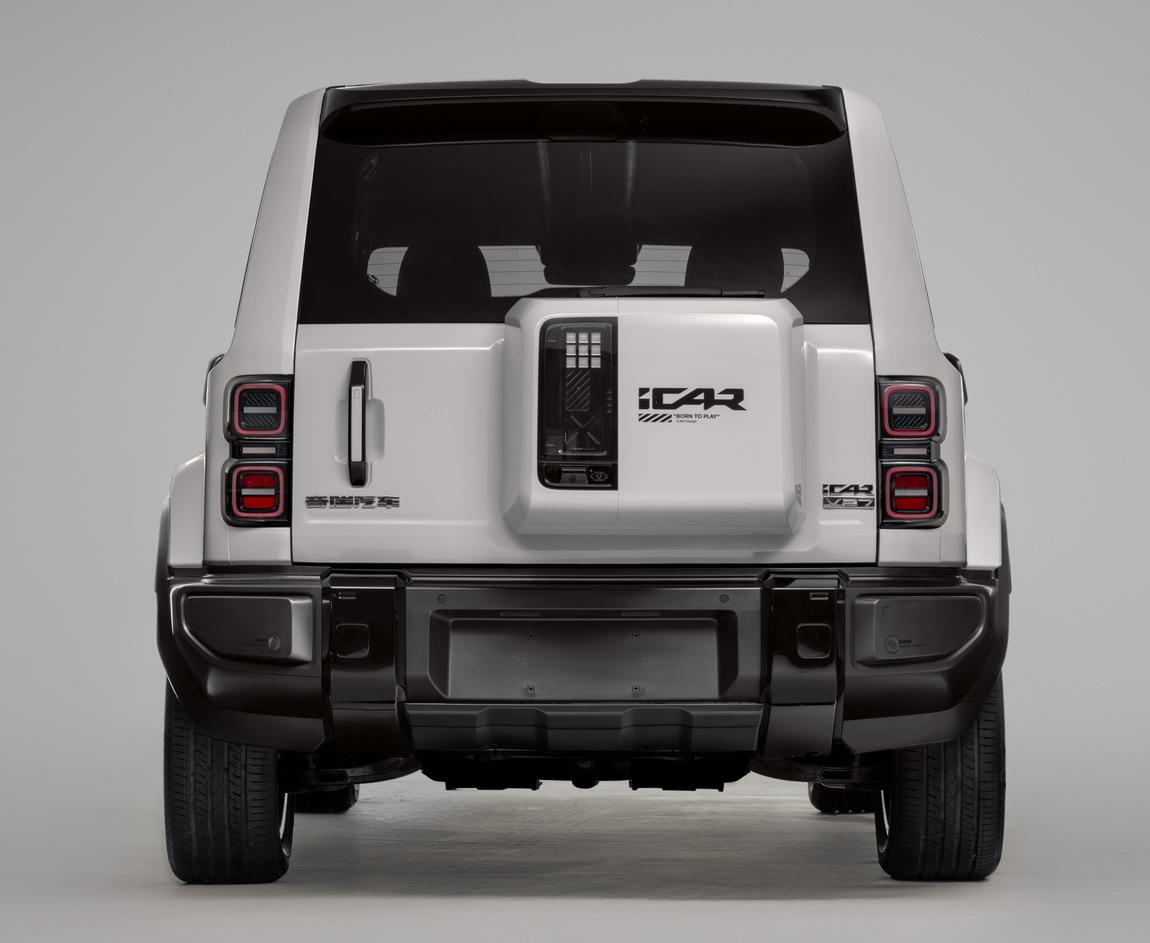 iCAR V27 是目前 iCAR 品牌最大的一款车,其延续 iCAR V23 的硬派设计,大车身的加持也使其看上去颇为霸气。其长宽高分别为 4909/1976/1855 或 1894mm,轴距为 2910mm。值得一提的是,新车提供两种不同样式的“小书包”,预计可选外挂式备胎或储物箱。