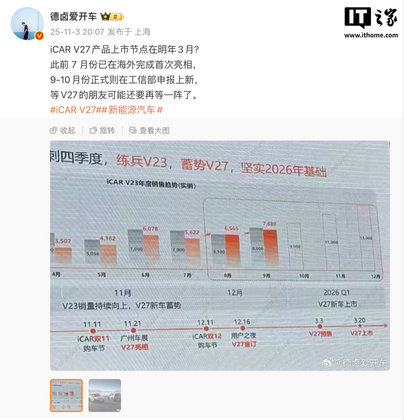 IT之家 11 月 3 日消息,今天晚间,博主 @德卤爱开车 发布消息称,奇瑞 iCAR 旗下的全新车型 —— 中型增程 SUV V27 将于明年 3 月 3 日预售,同月 20 日正式上市。